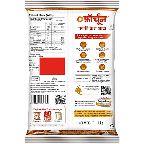 Discover the authentic taste and unparalleled nutrition of Fortune Chakki Fresh Atta, crafted from the finest wheat fields across India. This premium quality atta undergoes a traditional chakki process that retains all the natural goodness and flavour, ensuring your rotis stay soft and fluffy for longer.